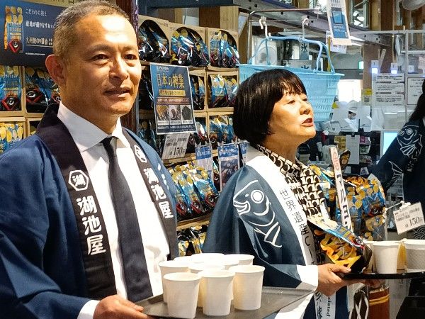 湖池屋九州支店・福島支店長と宗像市・伊豆市長による試食PR