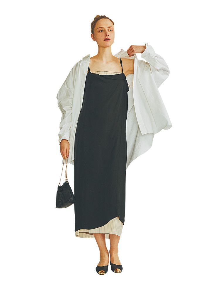 【STYLING POINT】女らしさが出せる一方、ふだん使いにはやや勇気がいる細身&華奢ストラップのワンピース。素肌をそれとなく隠すように白のえりつきシャツを羽織れば、品をわきまえた「日常になじむセンシュアル」へと変化。