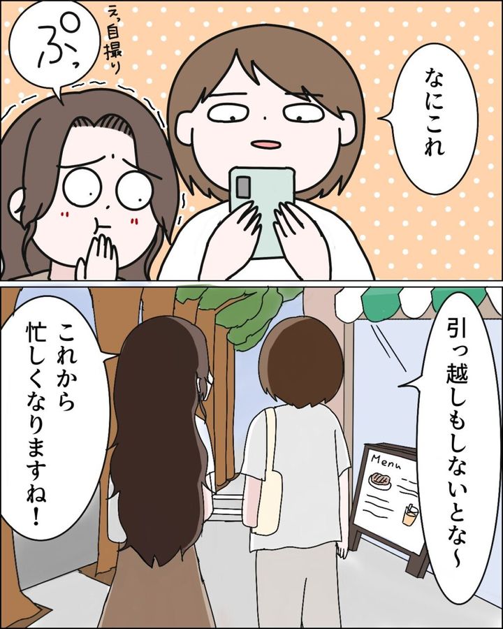 写真を見た私は「なにこれ」と呆れ、カナちゃんは「え、自撮り?ぷっ」と思わず吹き出していました。役所からの帰り道、「引っ越しもしないとな~」「これから忙しくなりますね!」とカナちゃんと話しながら前向きな気持ちになりました。