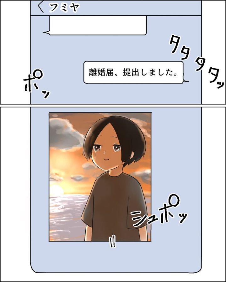 離婚届を提出したことをフミヤに連絡すると、なぜか夕暮れの海辺で涙を流して物思いにふけるフミヤの写真だけが送られてきました。
