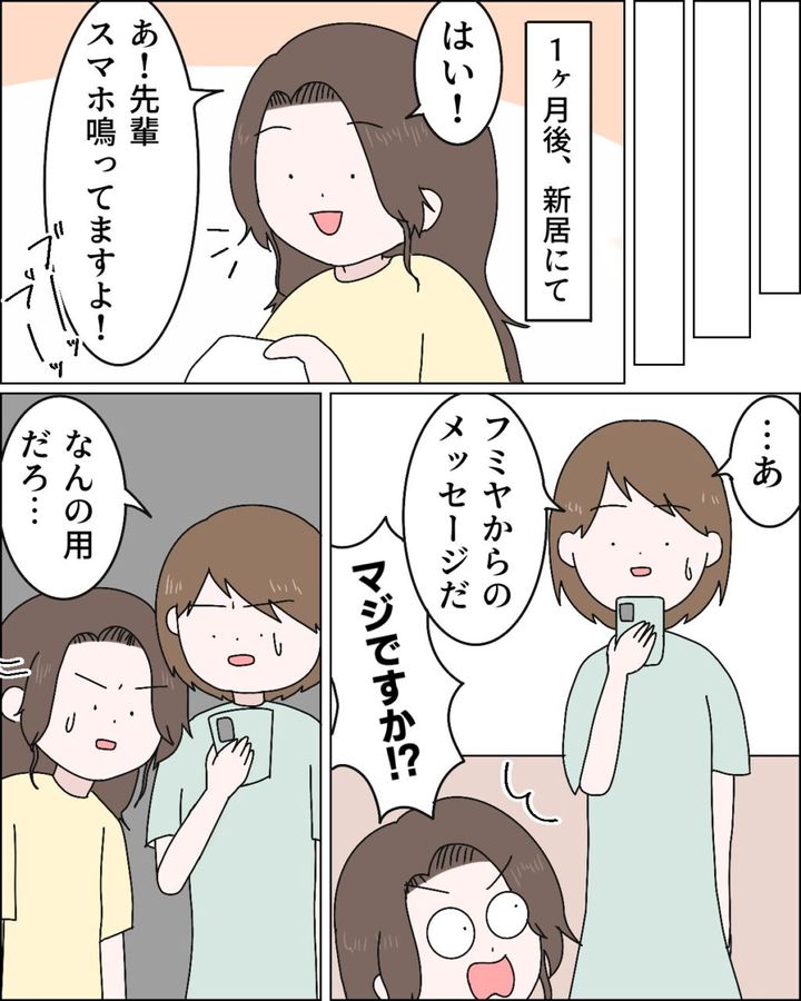 1ヶ月後。私は新居に引っ越し新たな生活を始めていました。この日も家に遊びに来ていたカナちゃんに「先輩スマホ鳴ってますよー」と言われ見てみると、フミヤからのメッセージでした。「・・あ。フミヤからのメッセージだ」と思わず呟くと「マジですか!?」と驚くカナちゃん。私は「なんの用だろ・・」と恐る恐るメッセージを開きました。