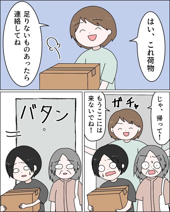 離婚届にフミヤさんのサインをもらった私は、すぐさまフミヤの荷物をダンボール箱にまとめて「はい、これ荷物。足りないものあったら連絡してね」と言って手渡すと、「じゃ、帰って!もうここには来ないでね!」と言って笑顔でフミヤと義母を家から追い出しました。