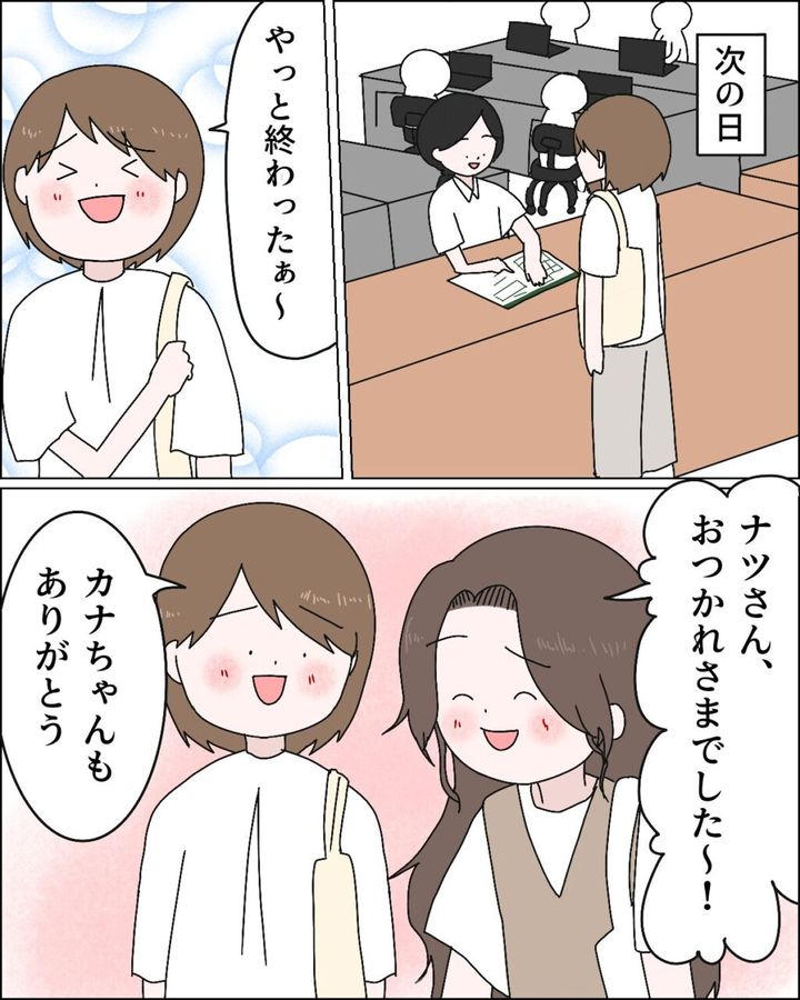 次の日。さっそく役所に離婚届を提出した私は「やっと終わったぁ~」と何とも言えない清々しい気持ちになりました。ずっと相談に乗ってくれて今日も役所に付き合ってくれた後輩のカナちゃんに「ナツさん、おつかれさまでした~」と言われ、「カナちゃんもありがとう」と心から感謝を伝えました。