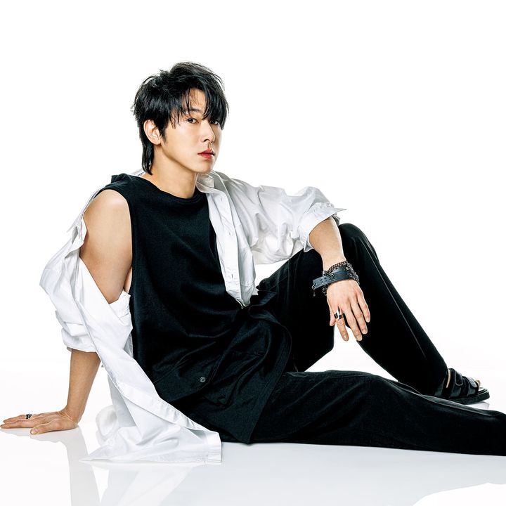 【チャンミン】シャツ ¥156,200 ニットベスト ¥40,700 サンダル ¥81,400 リング ¥101,200 レザーブレスレット ¥94,600(すべてヨウジヤマモト/ヨウジヤマモト プレスルーム)パンツ ¥69,300(ワイズフォーメン/ワイズ プレスルーム)【ユンホ】シャツ ¥71,500 ニットベスト ¥38,500 サンダル ¥81,400 リング[右手]¥93,500[左手]¥105,600 レザーブレスレット ¥88,000(すべてヨウジヤマモト プールオム/ヨウジヤマモト プレスルーム)パンツ ¥66,000(ワイズフォーメン/ワイズ プレスルーム)