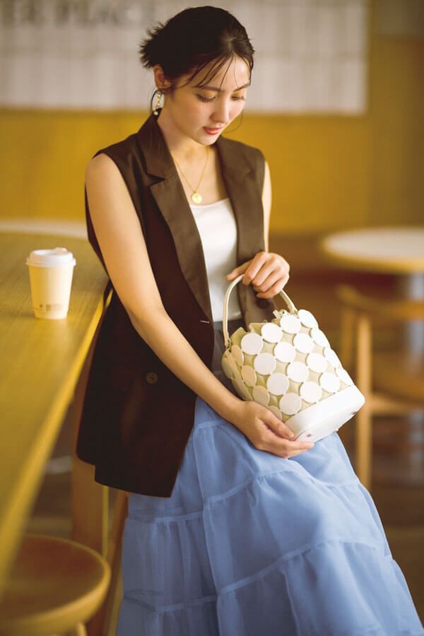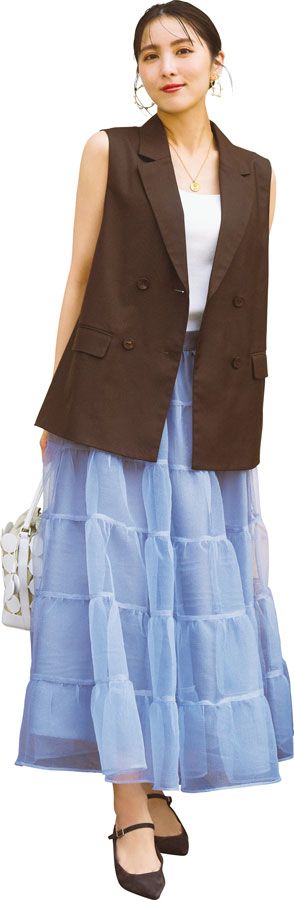 ジレ¥13,200/リリアン カラット スカート¥18,700/リランドチュール タンクトップ¥4,990/アンフィーロ(オンワード樫山) イヤリング¥7,700/ステラハリウッド ネックレス¥9,900/チビ・ジュエルズ(チビジュエルズ・ジャパン) バッグ¥199,100/ピエール アルディ(ピエール アルディ 東京) ミュール¥20,900/ルーニィ