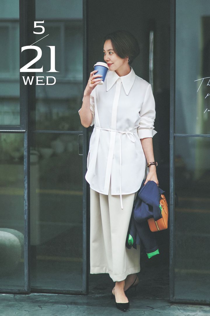 出番が多い白シャツこそ、長めの衿や丈、透け感のある今年っぽいデザインに更新!ウエストマークすればスカートにアウトしてもバランス良く着こなせます。ジャケットやパンプスで淡いワントーンをピリッと引き締めて。