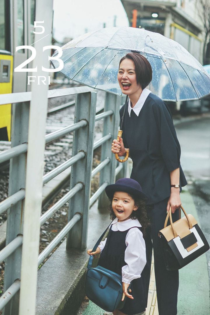 雨の日の送迎にはイージーケアのネイビーセットアップが大活躍!ダークトーンのコーデも、トップスの白衿や配色バッグのおかげで地味見えを回避。そのまま通勤やお出かけするママにも、ちょうどいいきちんと感です。