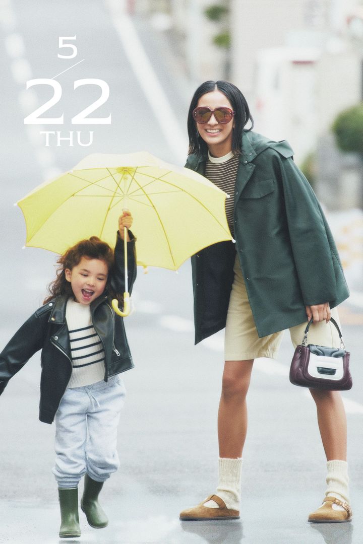 旬のハーフパンツは、梅雨シーズンこそ取り入れたいアイテム。裾が汚れる心配がなく、ボリュームのある雨の日アウターとも好相性!ミニバッグやサングラスでちょいモードに振るのが大人っぽく穿くコツです。
