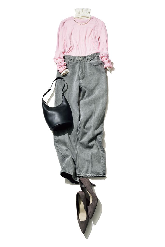 ミルキーピンクのアイテムが豊富な今季、白タートル同様の透け感のあるピンクをセレクト。えり元とそで口からのぞかせた白と、淡いトーンでもハンサムにふれるグレーのデニムで糖度を引き算。すると甘色もクールに転じて、愛嬌のある大人っぽさに好転。