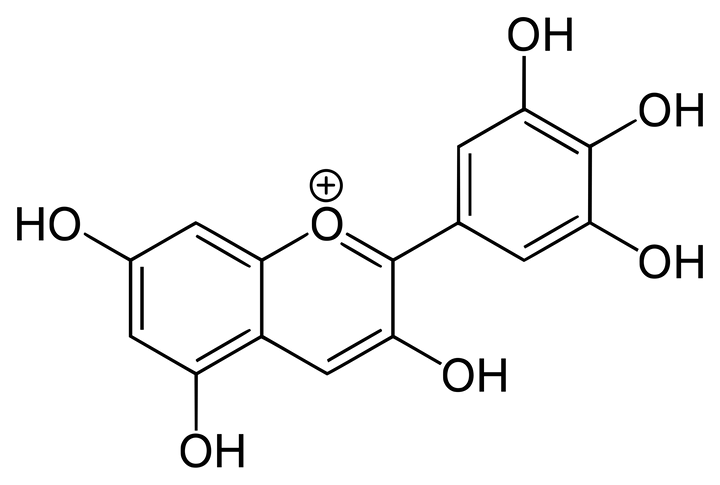 現在、植物の花弁において“青く”見える色をつくる代表的な色素は、アントシアニン(anthocyanin)と呼ばれる水溶性色素です。その中でも特に、デルフィニジン(delphinidin)というタイプのアントシアニンが青色を発現する鍵を握っているとされています。