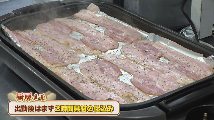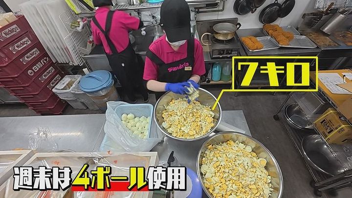 スタッフ:「卵は大体2,000個くらいですね。平均で。人気のダブルエッグとか卵を使うサンドイッチが主ですね。きょうは14個分の鍋をやるので150キロほど」