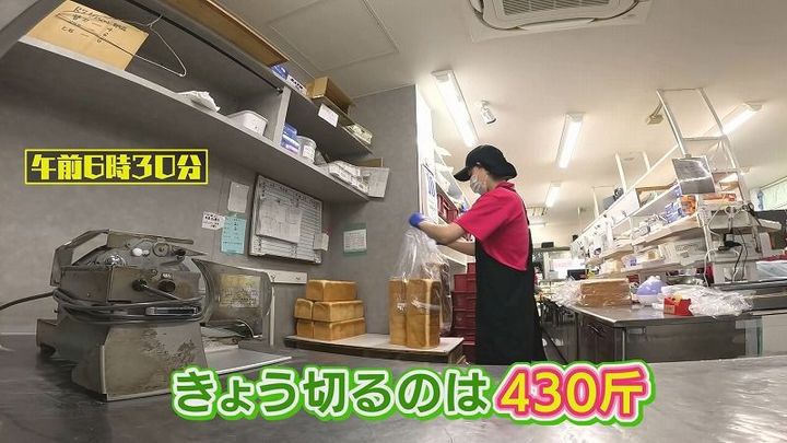スタッフ:「今日切るのは430斤。厚切り、薄切り、普通切りの3種類ありますね」