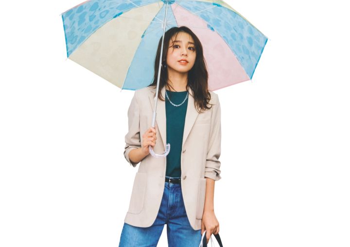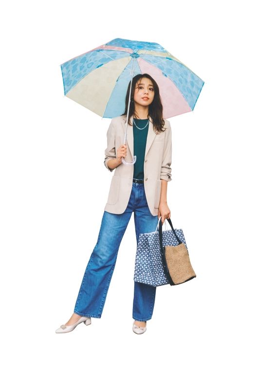 雨予報の日は、ぬれてもすぐ乾くジャケットや撥水効果の高い靴を準備。メンズっぽいシルエットのジャケットは、冷房対策はもちろん、デニムにも馴染んでくれるから休日も手放せません。