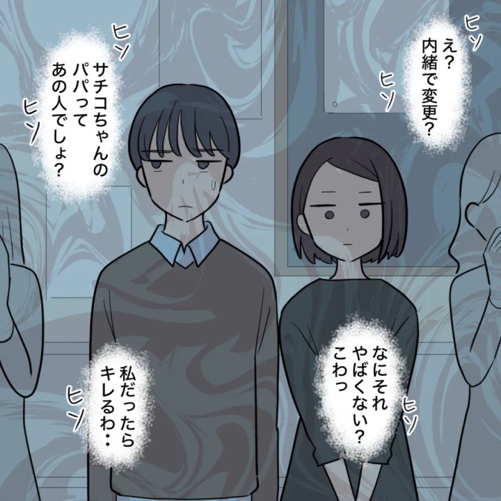 「え?内緒で変更?」「なにそれ。やばくない?こわっ」「サチコちゃんのパパってあの人でしょ?」「私だったらキレるわ・・」