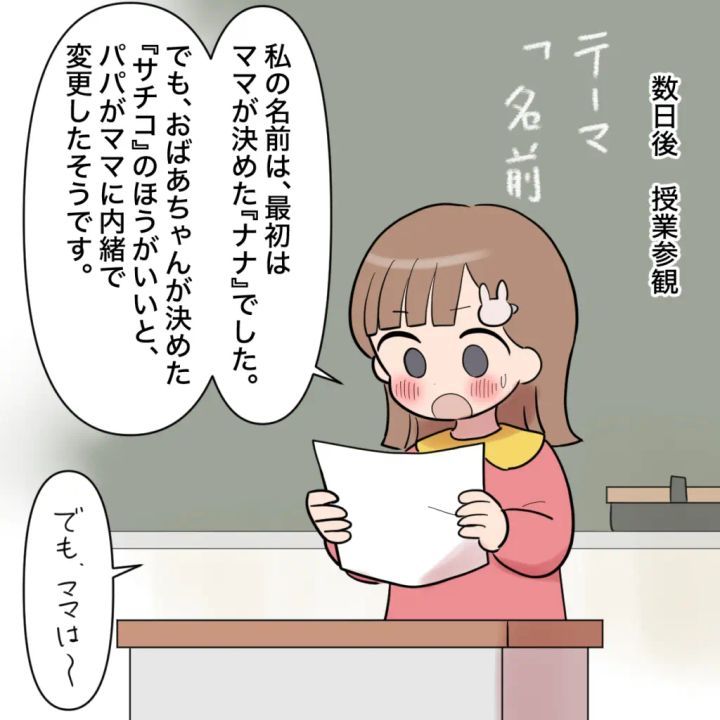 「私の名前は、最初はママが決めた『ナナ』でした。でも、おばあちゃんが決めた『サチコ』のほうがいいと、パパがママに内緒で変更したそうです。でもママは・・」サッちゃんが一生懸命発表するのを聞いていたショウタと私。