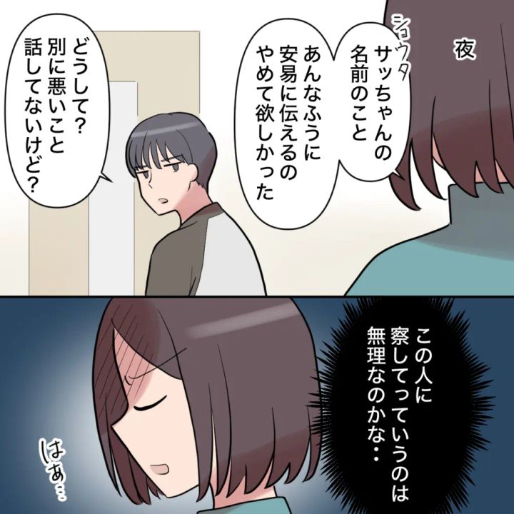 「ショウタ、サッちゃんの名前のこと、あんなふうに安易に伝えるのやめて欲しかった」ショウタにそう言うと、「どうして?別に悪いこと話してないけど?」とぶっきらぼうに答える姿に、「この人に察してっていうのは無理なのかな・・」と思わずため息が。