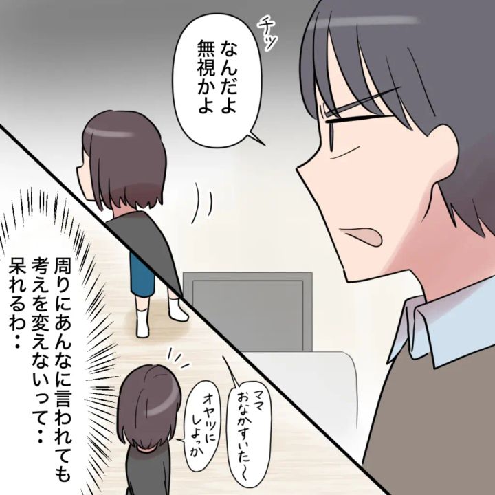 すると、「チッなんだよ無視かよ」と睨みつけるショウタの視線を感じつつ、「ママおなかすいた~」エイタにそう言われ「おやつにしよっか」と答える私は、「周りにあんなに言われても、考えを変えないって・・呆れるわ・・」とドン引きしていたのでした。