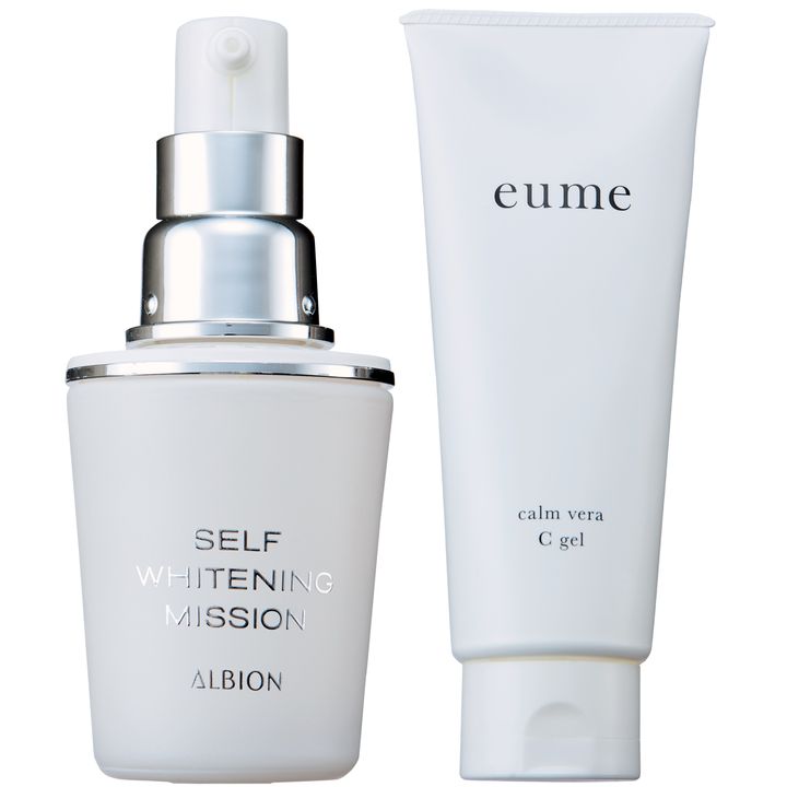 アルビオンのセルフホワイトニングミッション(左)はトラネキサム酸がシミを防いでくれます。アロエエキスとビタミンC誘導体配合のイウミー(右)のジェルでパックをすることも。