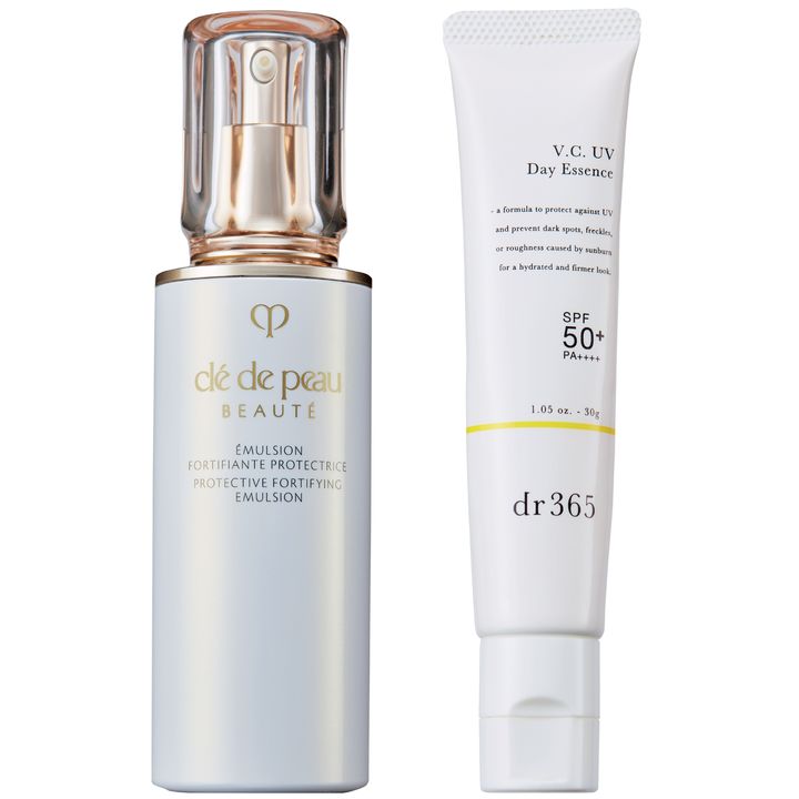 SPF25のクレポ乳液(左)は日中の紫外線ダメージをサポート。dr365の日焼け止め(右)は国内最高基準のUVカット機能搭載のハイスペック美容液。