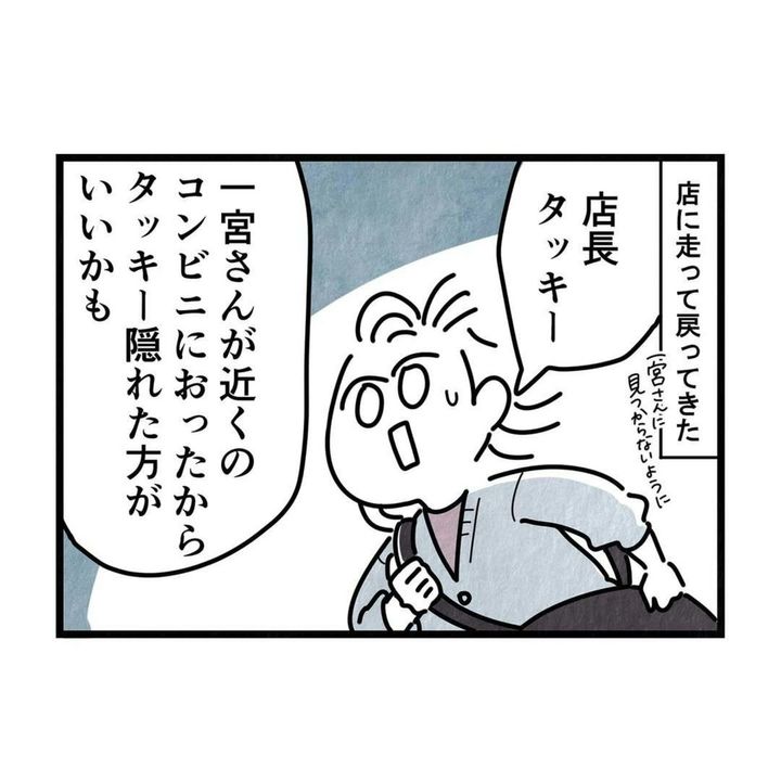 お昼時間に近隣のコンビニで一宮さんを見かけ、急いでお店へ戻った永吉さん。その後、永吉さんと店長の連係プレーでタッキーは守られました。そして、一宮さんには永吉さんと店長から苦言が呈されました。