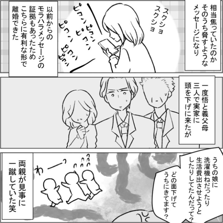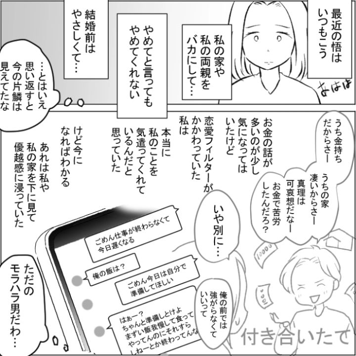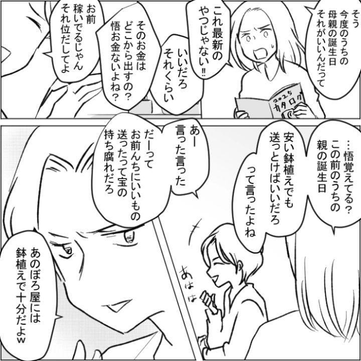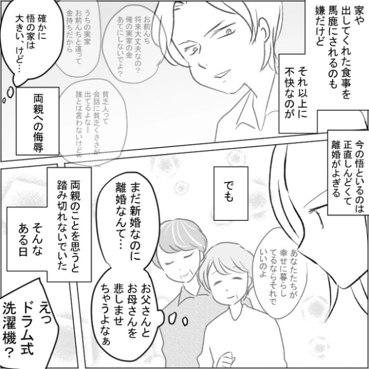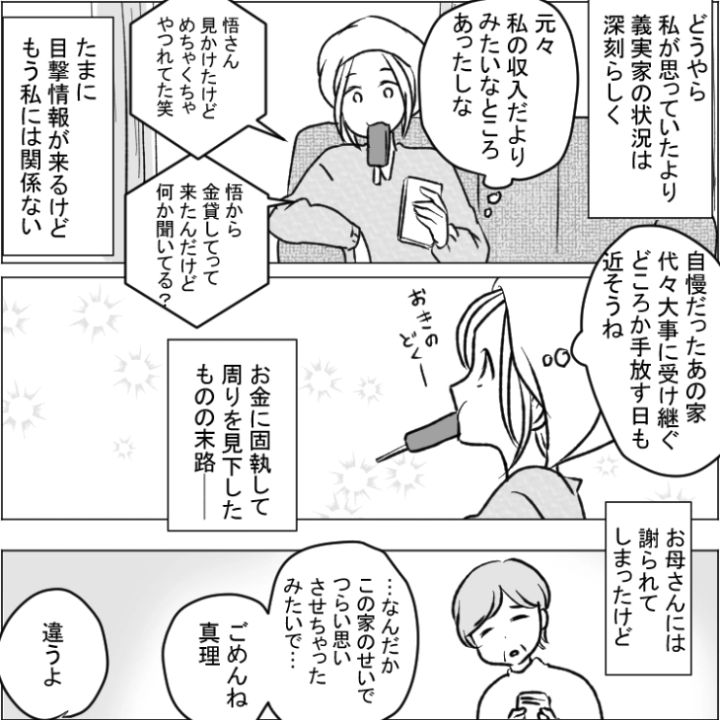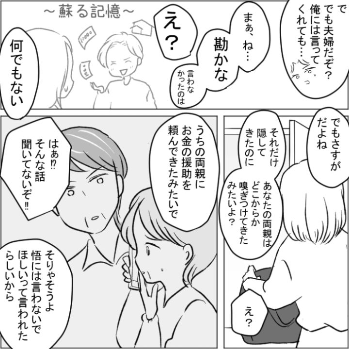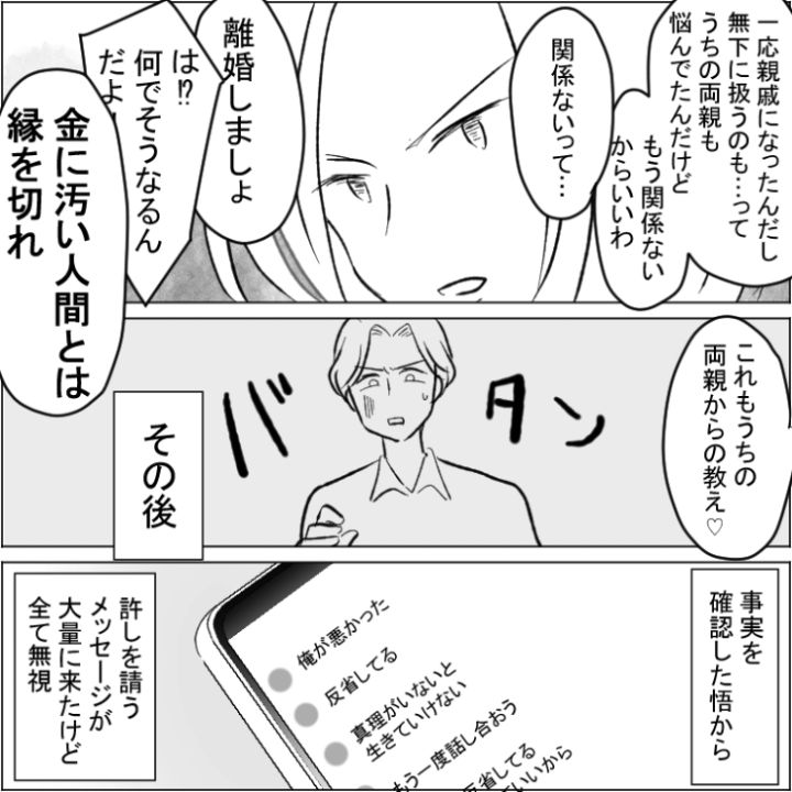 貧乏だと馬鹿にしていた主人公の実家から実は援助を受けていたことをはじめて知った悟。謝罪にきたところで人間性は変わらないので、縁を切って正解ですね。