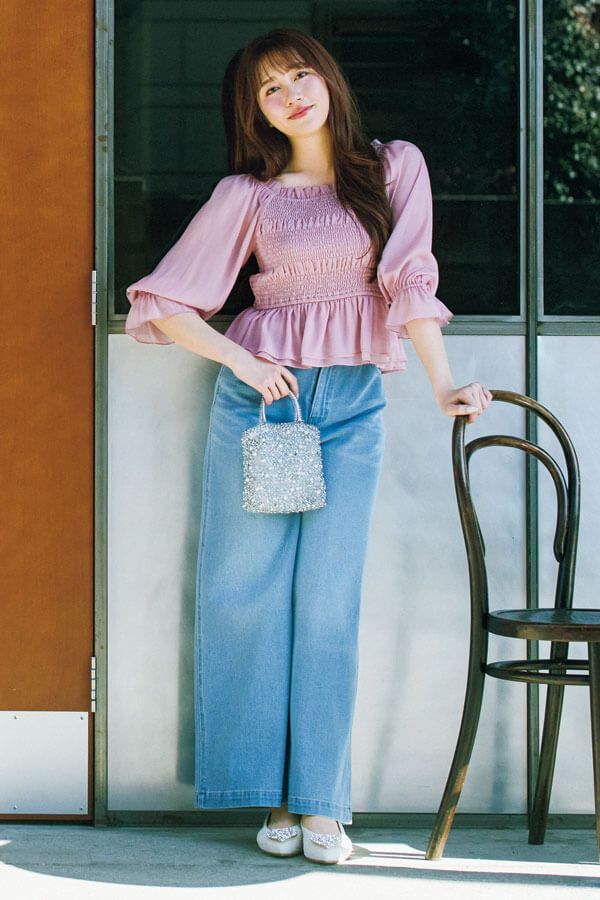 ワイドデニムに合わせたシャーリングブラウスは、二の腕を可愛くカバーできるだけでなく、ペプラムデザインで気になる腰まわりもカムフラージュしてくれる優れもの♡