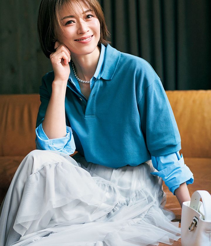 ポロシャツ¥18,700(エラシオ/八木通商)シャツ¥25,300(トラディショナル ウェザーウェア/トラディショナル ウェザーウェア ルミネ有楽町店)スカート¥24,200(アルページュストーリー/アルページュストーリー プレスルーム)バッグ¥53,900(ペリーコ/アマン)リング¥38,500〈マユ〉ネックレス¥121,000〈マユオカマツ〉(ともにマユ ショールーム)