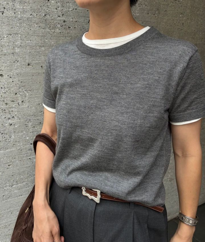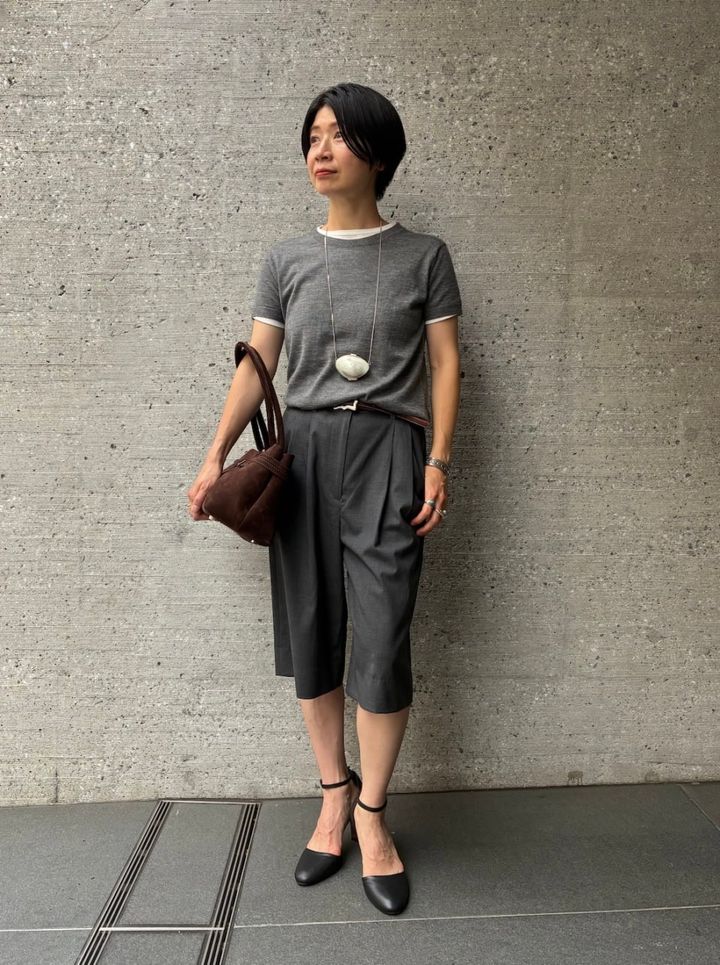 「カジュアルになりがちなTシャツですが、素材違いのニットTと重ねることでオフィスでも気兼ねなく着られるよう、キレイめなスタイリングに落とし込みました。インナーに着た白Tシャツが絶妙なバランスでチラッと見えるように計算されているので、ぜひレイヤードして着てほしいアイテムです。また、バランスの難しいハーフパンツも全体をグレーで統一し、真面目になりすぎないように大ぶりなアクセサリーをプラスすることで個性をプラスしています」