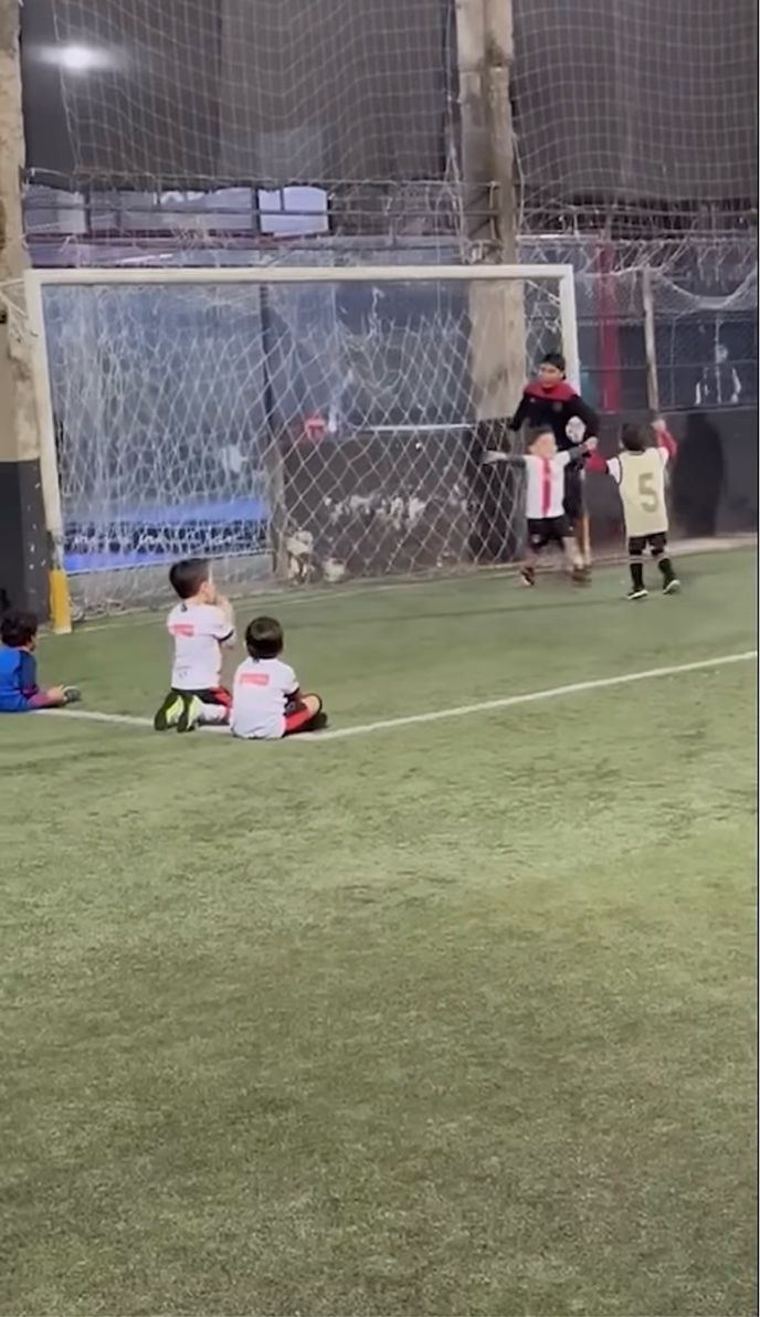 ゴールを決めてセレブレーションを行う男の子のもとへ駆け寄っていき、なんと一緒に喜んじゃっています! この子にとっては、勝ち負けよりも友達と一緒に喜ぶことの方が大切だったようです。