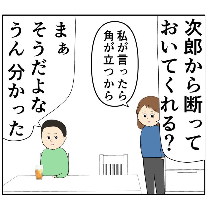 「次郎から断っておいてくれる?私が言ったら角が立つから」とさくらさんが言うと、次郎さんは「まぁそうだよな。うん、分かった」とさくらさんの気持ちを分かってくれました。