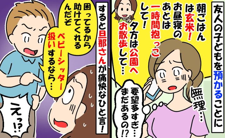 しかし子どもを預かる前日に、友人からまさかの内容の電話がありました。「引き受けてくれてありがとう! 気をつけてほしいことを言うね。まず朝ごはんは玄米と野菜スティックに、蒸したとりささみを食べさせて。10時ごろのおやつは無添加で、砂糖が入っていないものを与えて。それから、おしりふきは必ずおしりふきウォーマーで温めて、かぶれないように気をつけてね。お昼寝は12時から14時半まで。必ず寝かせてね。起きたら多分私を思い出して寂しがるから、1時間は抱っこしてあげてほしい。夕方は公園までお散歩を……」と細かな要望を長々と続けます。