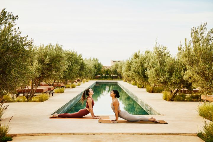 Wide shot friends performing sunrise yoga beside luxury resort pool