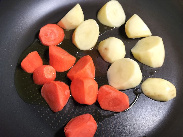 3. フライパンにオリーブオイルをひき、じゃがいもとにんじんを並べます。