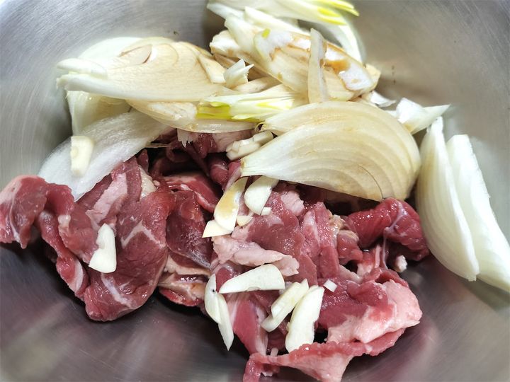 2. 別のボウルに薄切りの玉ねぎ、にんにく、牛肉を入れ、1の半分を加えて揉み込み、落としラップをして10分マリネします。