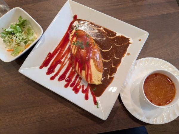 デミグラスソースとトマトケチャップのハーフ&ハーフです。 サラダとコンソメスープがついて1,200円。それに+400円でコーヒーをつけました。言わずもがな、左がケチャップ、右がデミグラス。