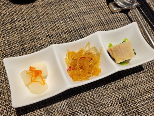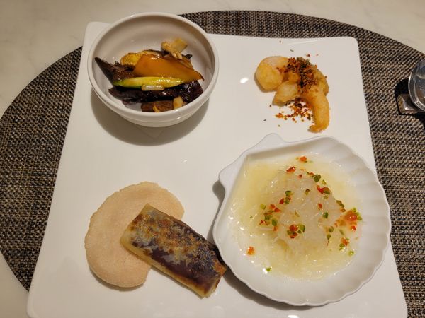 「バラエティプレート」(小海老のスパイシー揚げ、ホタテ貝柱と春雨の蒸し物、北京ダック、牛肉のオイスターソース炒め)