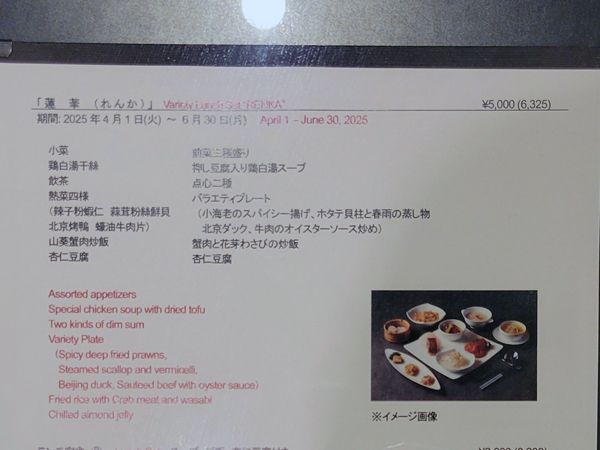 「蓮華」は、3カ月に1回メニューが変わる、人気のランチセット。現在提供中のメニューは6月30日(月)までとなっています。