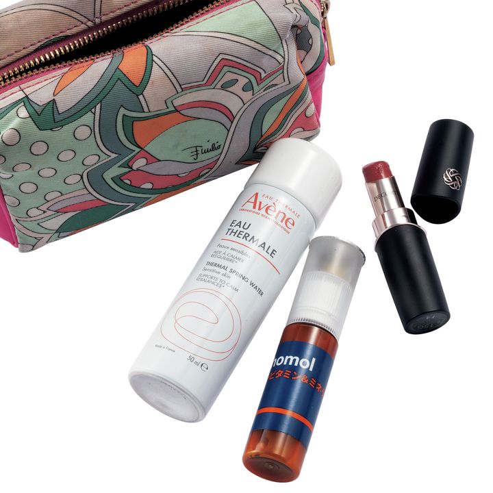 バズりまくりのコスデコのリップは15番を愛用中。orthomolは外出中のエネルギー補給に。乾燥を感じたら、アヴェンヌウォーターでこまめに潤い補給をしてツヤキープ。