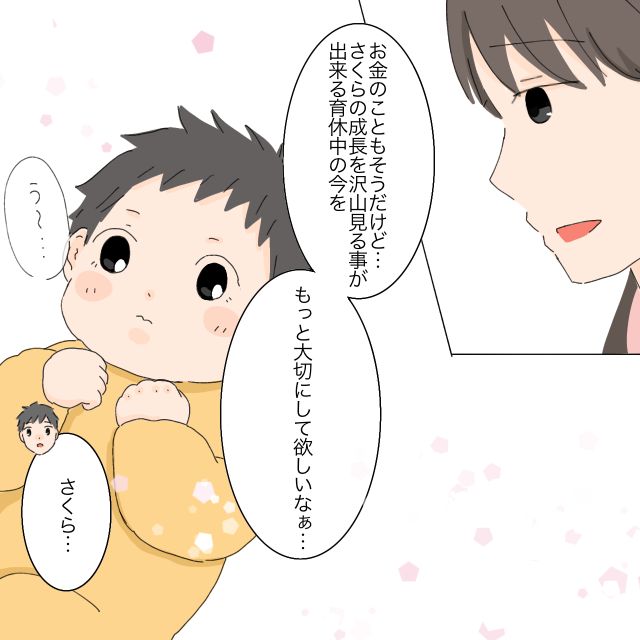 そして私は「お金のこともそうだけど・・・さくらの成長を沢山見る事が出来る育休中の今をもっと大切にして欲しいなぁ・・・」と思っていることを夫に伝えました。