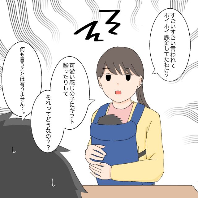 私も今まで我慢していたことが溢れ「すごいすごい言われてホイホイ課金してたわけ?可愛い感じの子にギフト贈ったりして。それってどうなの??」と詰めると冷や汗をかきながら「何も言うことは有りません・・・。」と答えました。