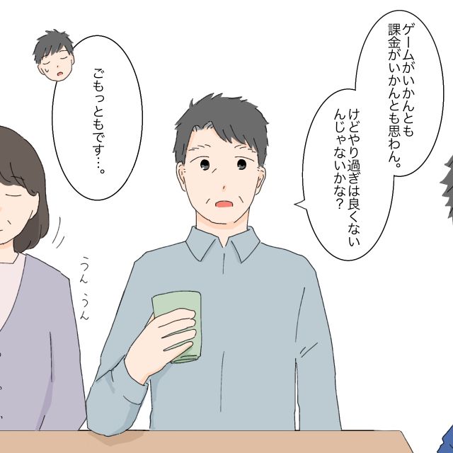 夫が謝った後、そのまま自宅で話し合いをすることになりました。父は「ゲームがいかんとも課金がいかんとも思わん。けどやり過ぎは良くないんじゃないかな?」と夫に言ってくれました。父の正論すぎる意見に夫は「ごもっともです・・・」と俯きます。
