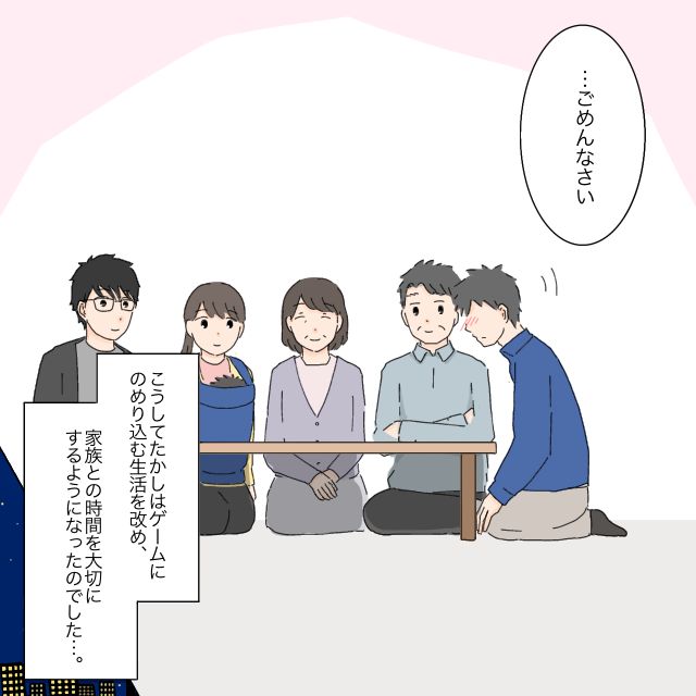 そして改めて「・・・・ごめんなさい」と謝る夫。こうしてたかしはゲームにのめり込む生活を改め、家族との時間を大切にするようになったのでした。