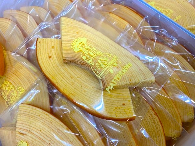 マッターホーンといえば、まず外せない看板商品がバームクーヘン。一層一層丁寧に焼き上げられたこのお菓子は、しっとりとした食感と、卵とバターのやさしい香りが特徴。パサつきがなく、口に入れた瞬間にほどけるような口どけが多くの人を虜にしています。人気商品は薄く切ったタイプのもの。