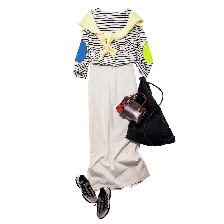 4.パッチワークボーダーT¥11,000(GREEN BUTTER/ジャック・オブ・オール・トレーズ プレスルーム)イエローカーディガン¥26,700(ORR/HANA SHOWROOM)バッグ¥15,180(イムラム)ハンドバッグ¥44,000(OSOI/ユナイテッドアローズ 渋谷スクランブルスクエア店)バッグチャーム¥30,800(String Ting/SHOWROOM CHRMR)靴¥11,000(FILA/フィラ カスタマーセンター)白ロングスカート着回し