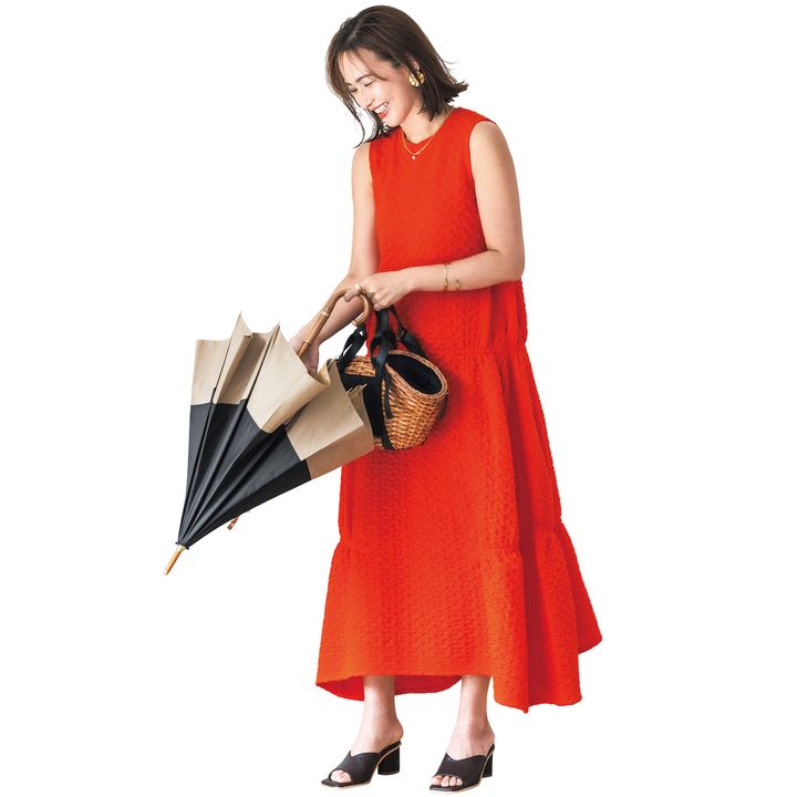 夏らしいビタミンカラーのフレアワンピにシックなバイカラーが着こなしを引き締める