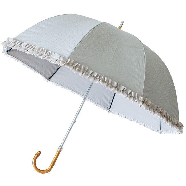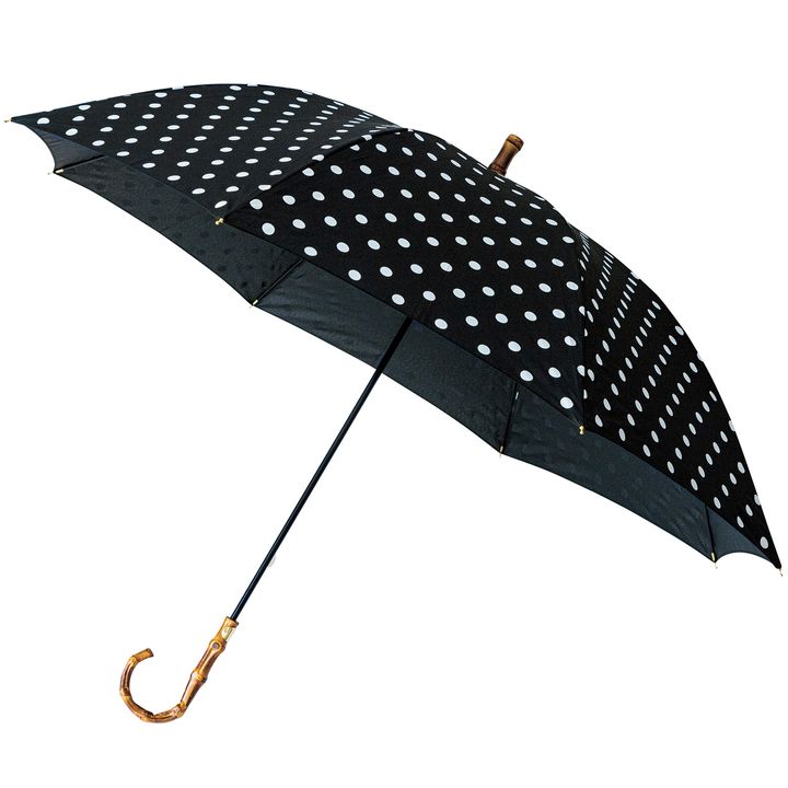 バンブーハンドルや黒の傘骨が、クラシカルなドット柄を大人っぽく格上げ。ミュートカラーで大人っぽい夏コーデのほどよいアクセントに。