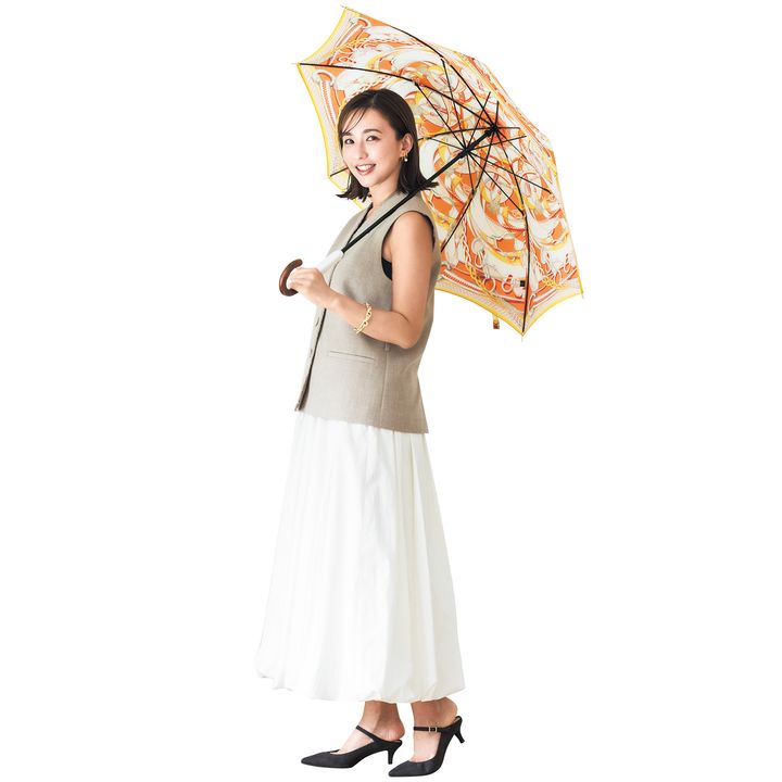 夏の日差しに映える、明るい日傘がシンプルコーデを華やかに。丁寧に手作業で染められた柄が、紫外線をしっかりブロックしてくれるのが嬉しい。晴雨兼用できる撥水・防水・UV加工。