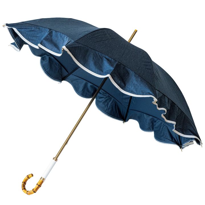 デニム×白パイピングで爽やかな印象に。海のシーンにもぴったり。[遮光率99%以上、UVカット99%以上]¥16,500(Gracy/ムーンバット)