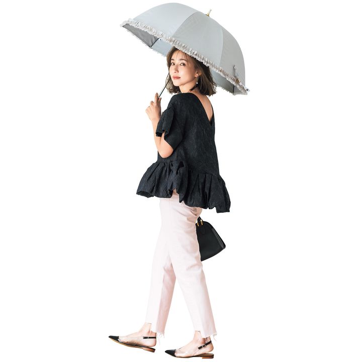 甘めブラウスやピンクのパンツには控えめカラーのフリル日傘がいい塩梅