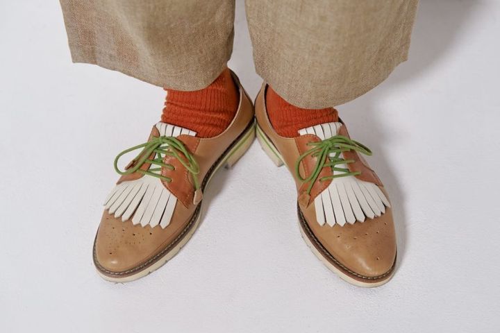 「この靴は、カジュアルにもきれいめにも合わせやすく、甲部分の配色やフリンジ付きのデザインも遊び心があって気に入っています」